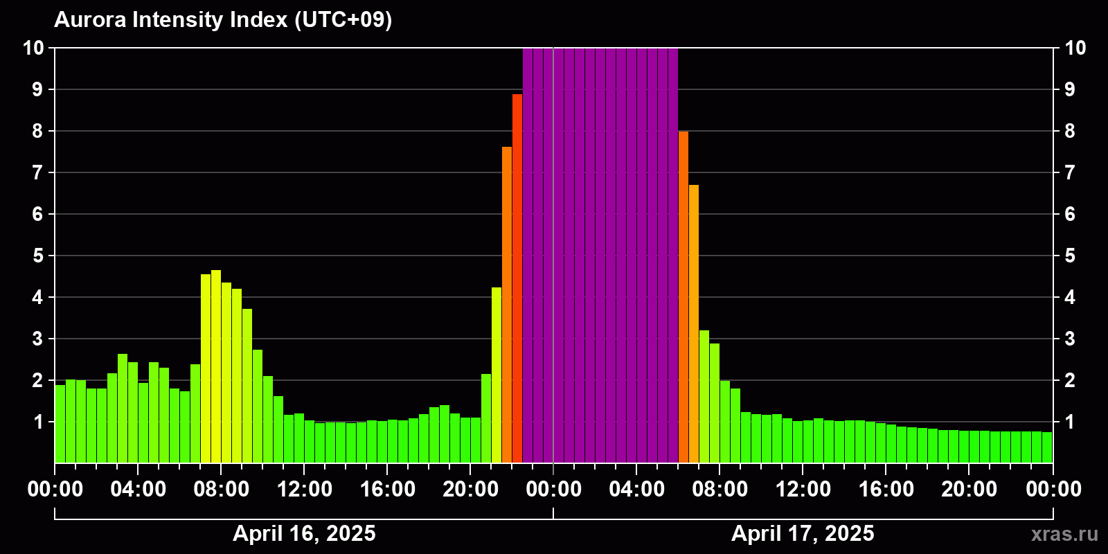 Changes in the auroral intensity index from 2025-04-16 to 2025-04-17 local time