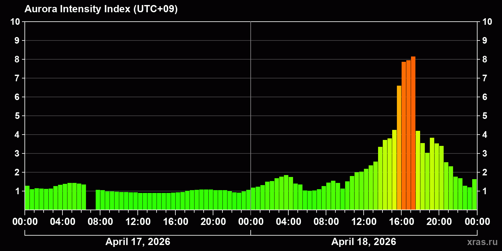 Changes in the auroral intensity index from 2026-04-17 to 2026-04-18 local time