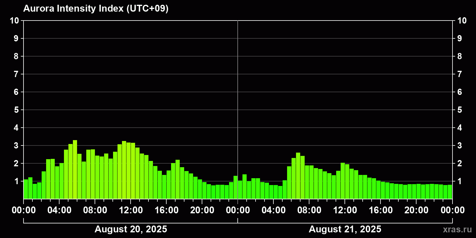 Auroral intensity index and the theoretically possible latitude of observations for nighttime in the Estern Hemisphere as of 2025-08-21 23:55 (end of day) local time