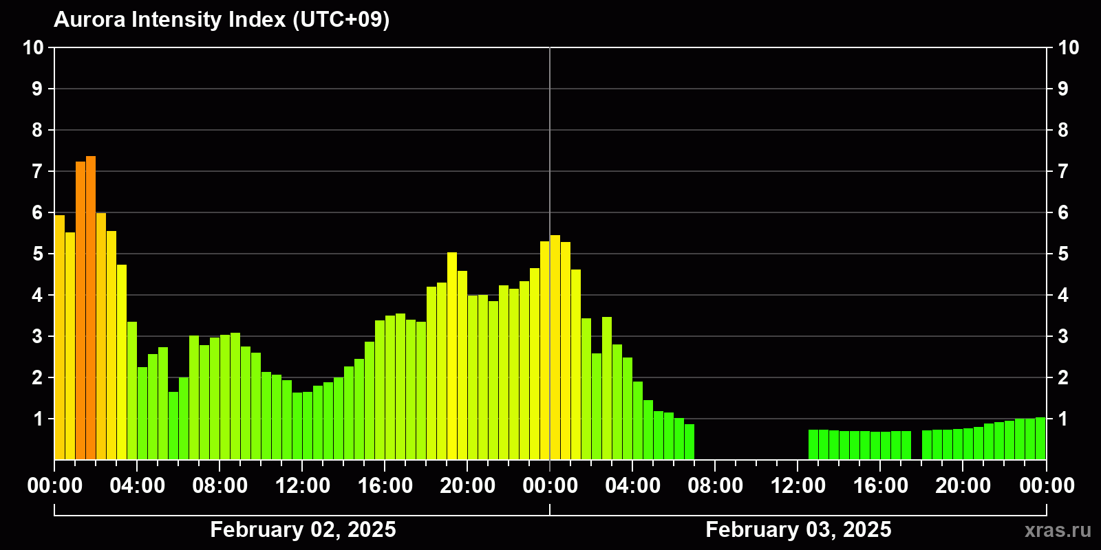 Changes in the auroral intensity index from 2025-02-02 to 2025-02-03 local time