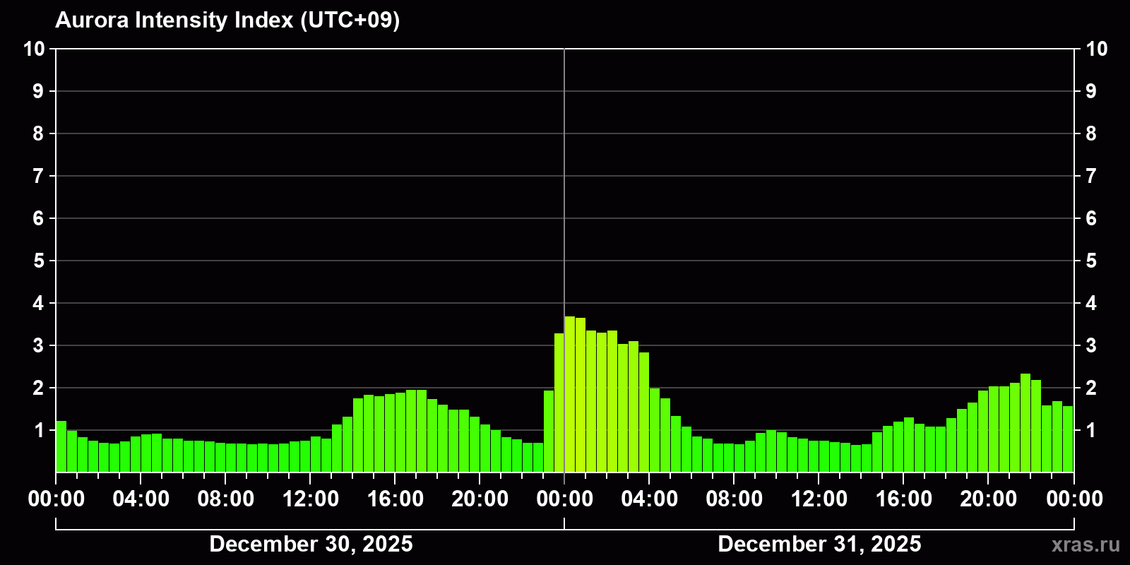 Changes in the auroral intensity index from 2025-12-30 to 2025-12-31 local time