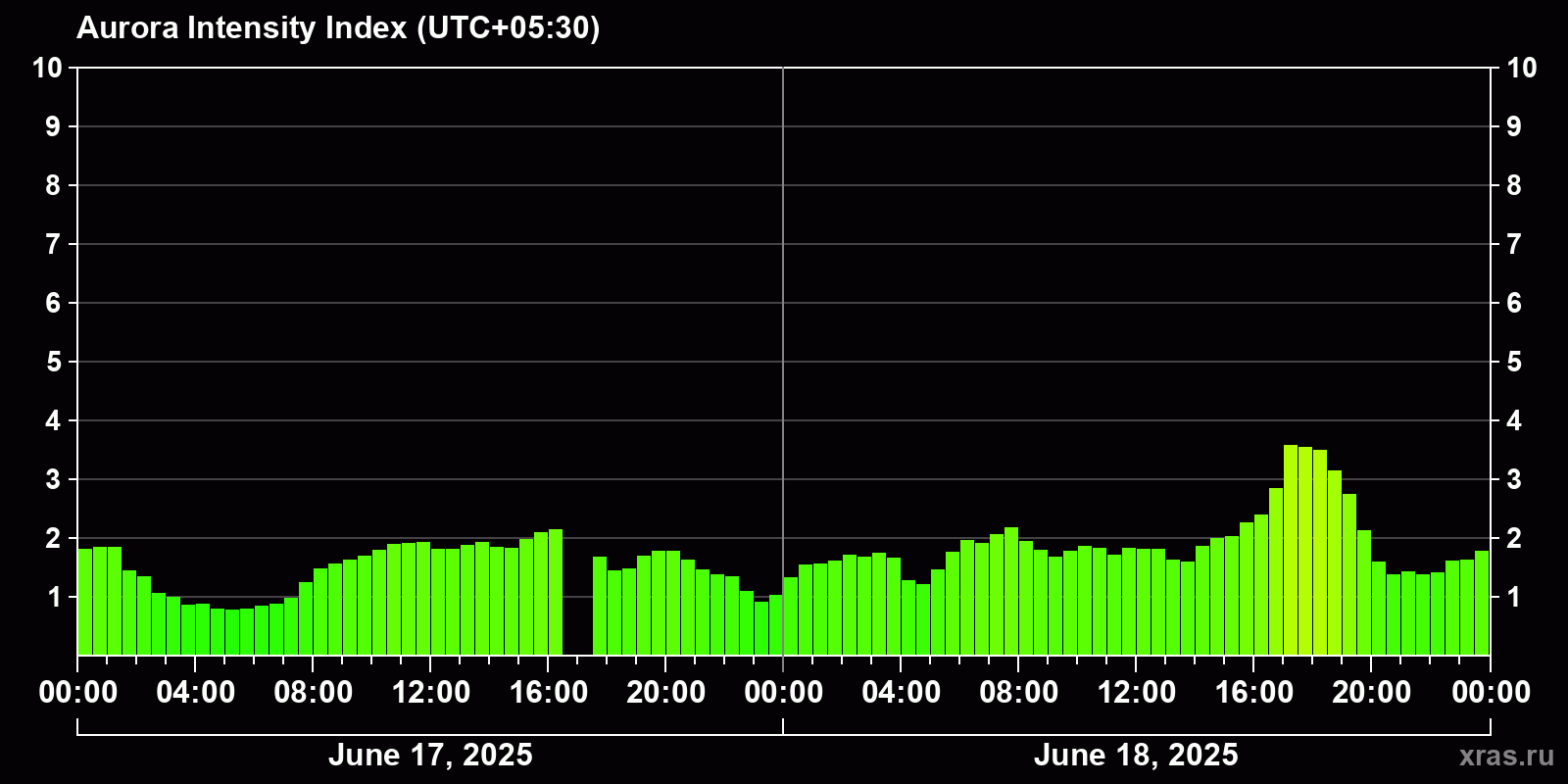 Changes in the auroral intensity index from 2025-06-17 to 2025-06-18 local time
