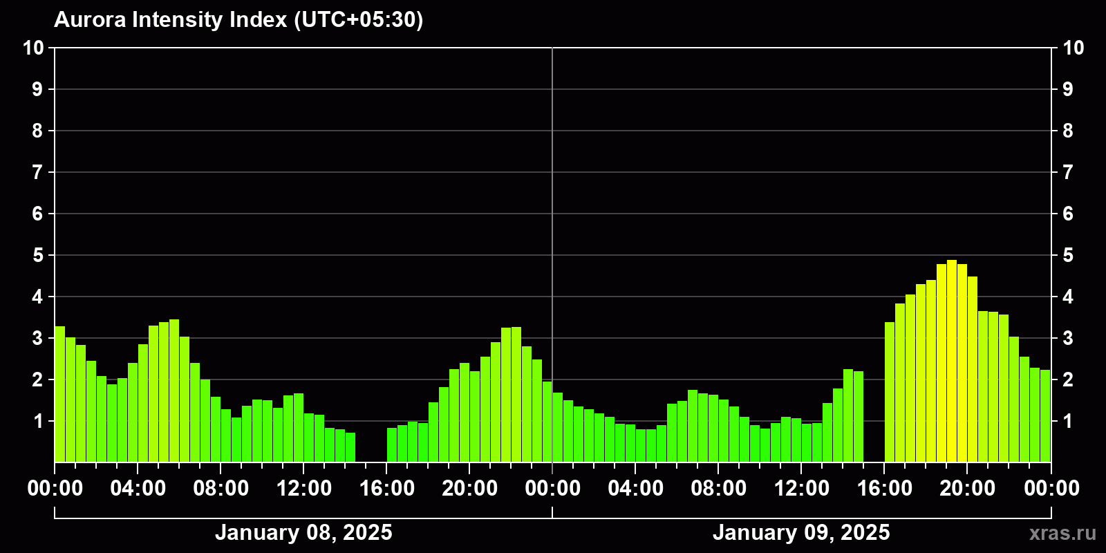 Auroral intensity index and the theoretically possible latitude of observations for nighttime in the Estern Hemisphere as of 2025-01-09 23:46 (end of day) local time