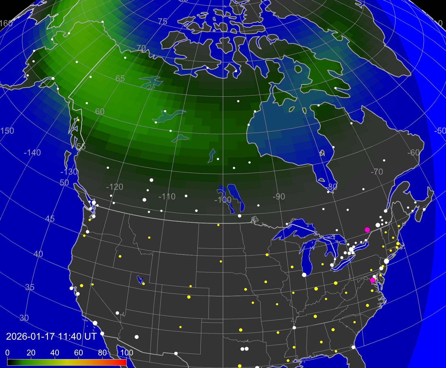 Индекс интенсивности полярных сияний и теоретически возможная широта наблюдений для ночного времени в западном полушарии