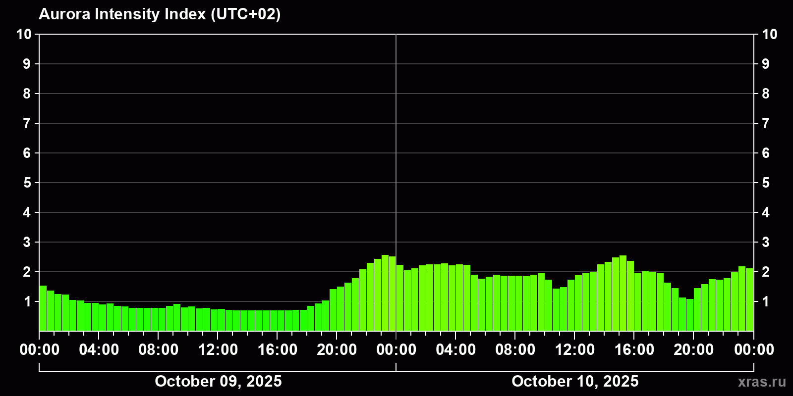 Auroral intensity index and the theoretically possible latitude of observations for nighttime in the Estern Hemisphere as of 2025-10-10 23:49 (end of day) local time
