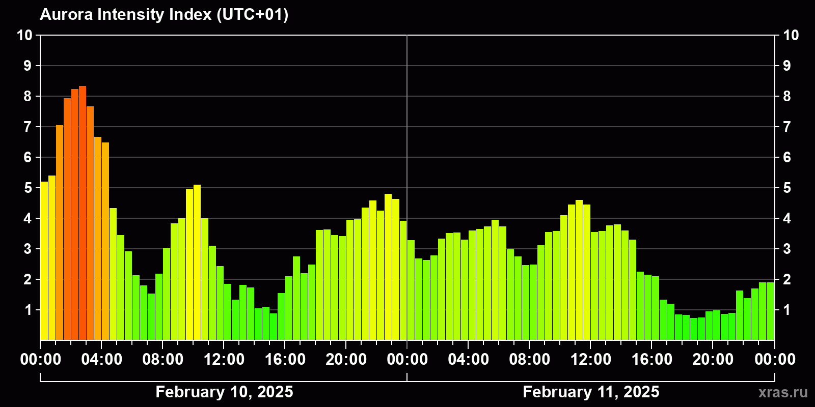 Auroral intensity index and the theoretically possible latitude of observations for nighttime in the Estern Hemisphere as of 2025-02-11 23:57 (end of day) local time