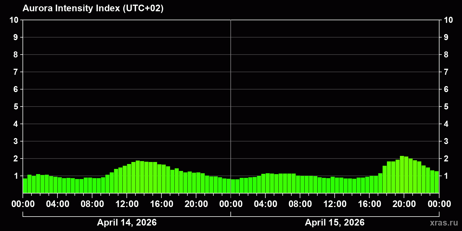 Changes in the auroral intensity index from 2026-04-14 to 2026-04-15 local time