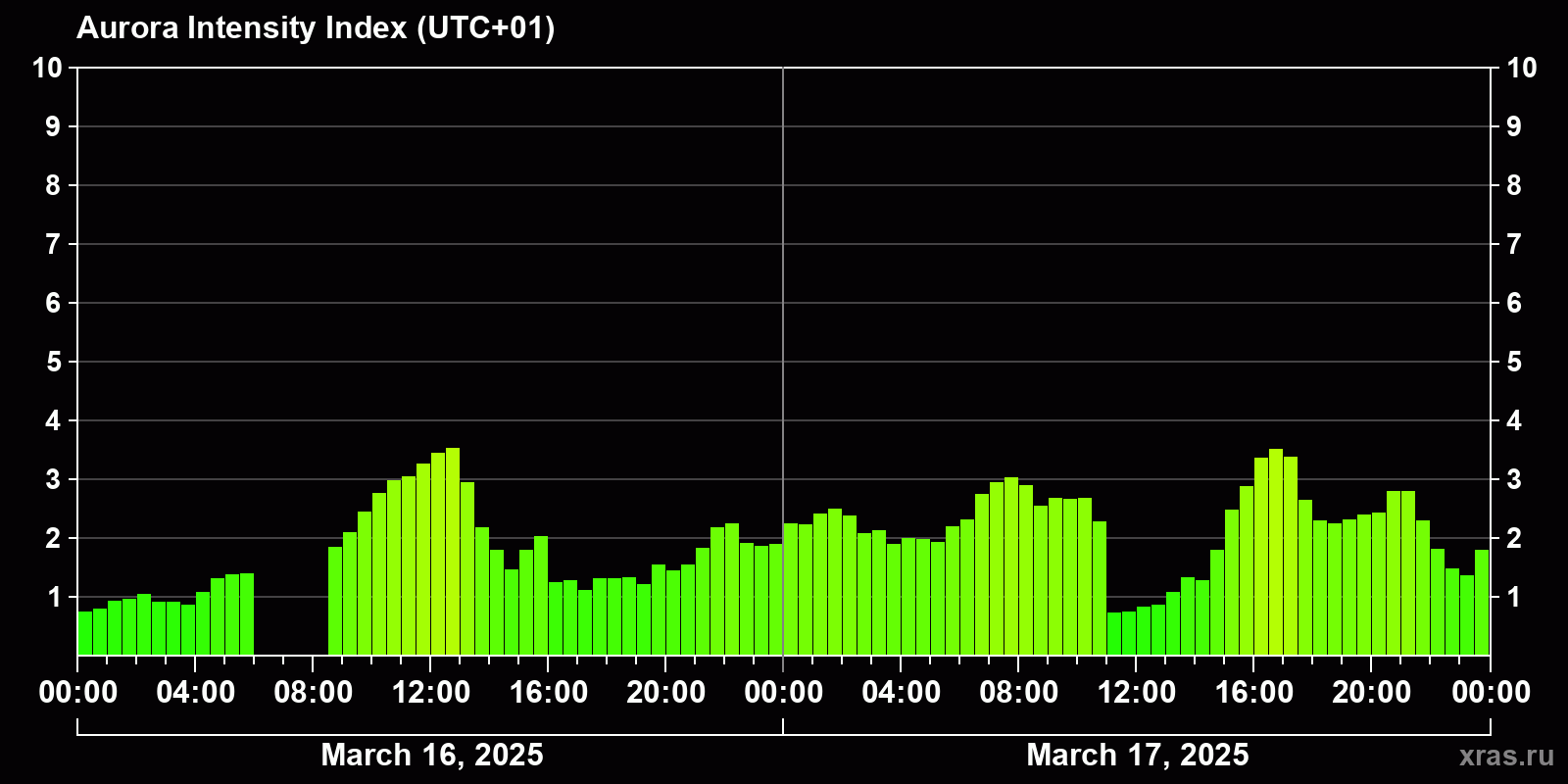Changes in the auroral intensity index from 2025-03-16 to 2025-03-17 local time
