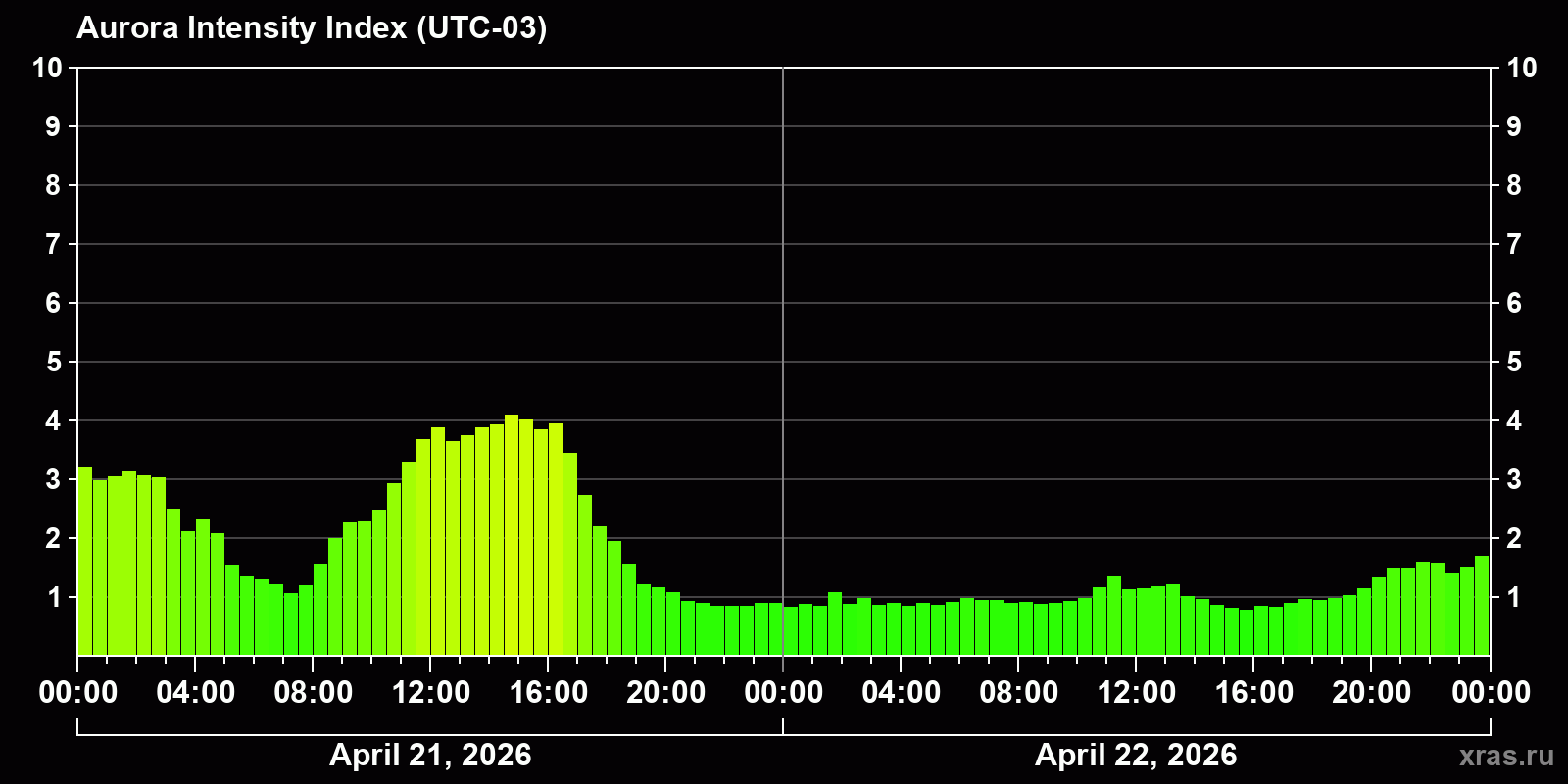 Changes in the auroral intensity index from 2026-04-21 to 2026-04-22 local time