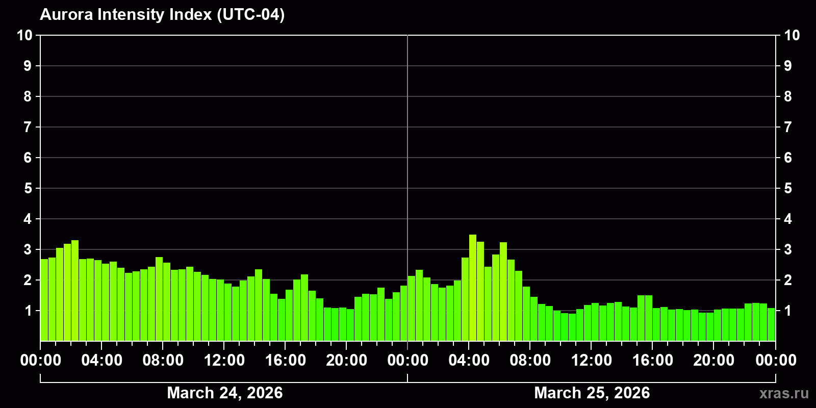 Auroral intensity index and the theoretically possible latitude of observations for nighttime in the Western Hemisphere as of 2026-03-25 23:58 (end of day) local time