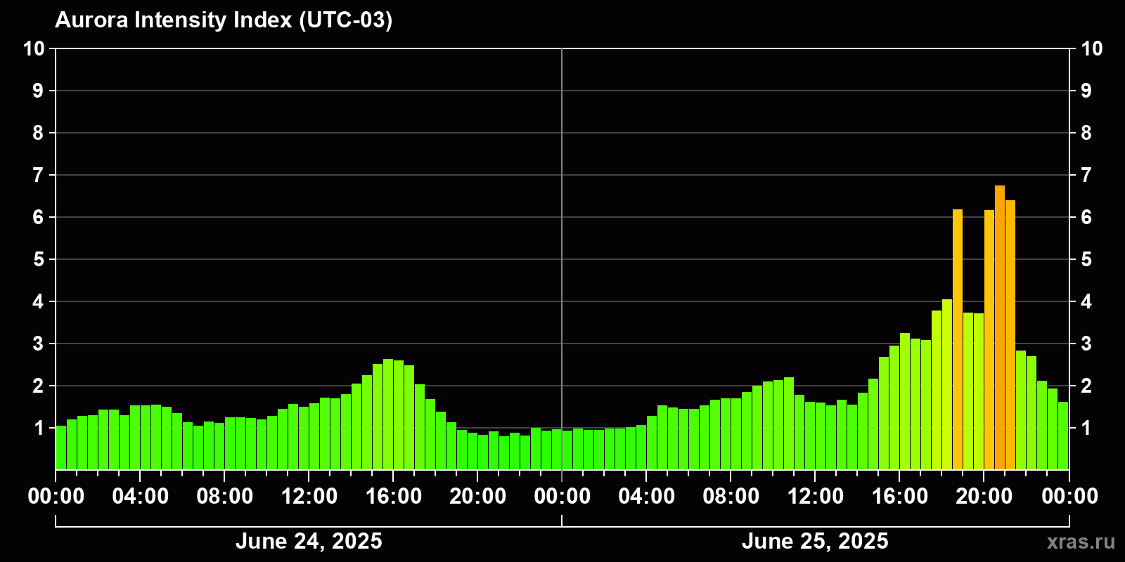Auroral intensity index and the theoretically possible latitude of observations for nighttime in the Western Hemisphere as of 2025-06-25 23:58 (end of day) local time