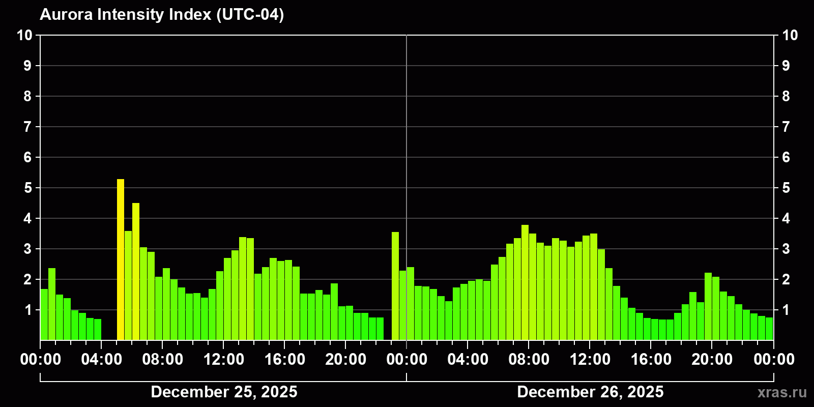 Changes in the auroral intensity index from 2025-12-25 to 2025-12-26 local time