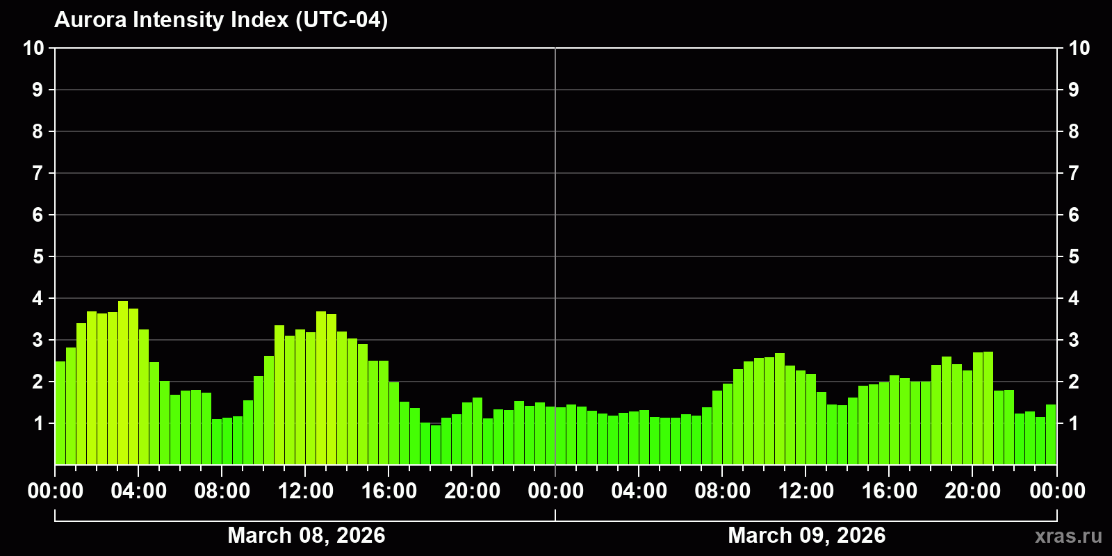 Auroral intensity index and the theoretically possible latitude of observations for nighttime in the Western Hemisphere as of 2026-03-09 23:52 (end of day) local time