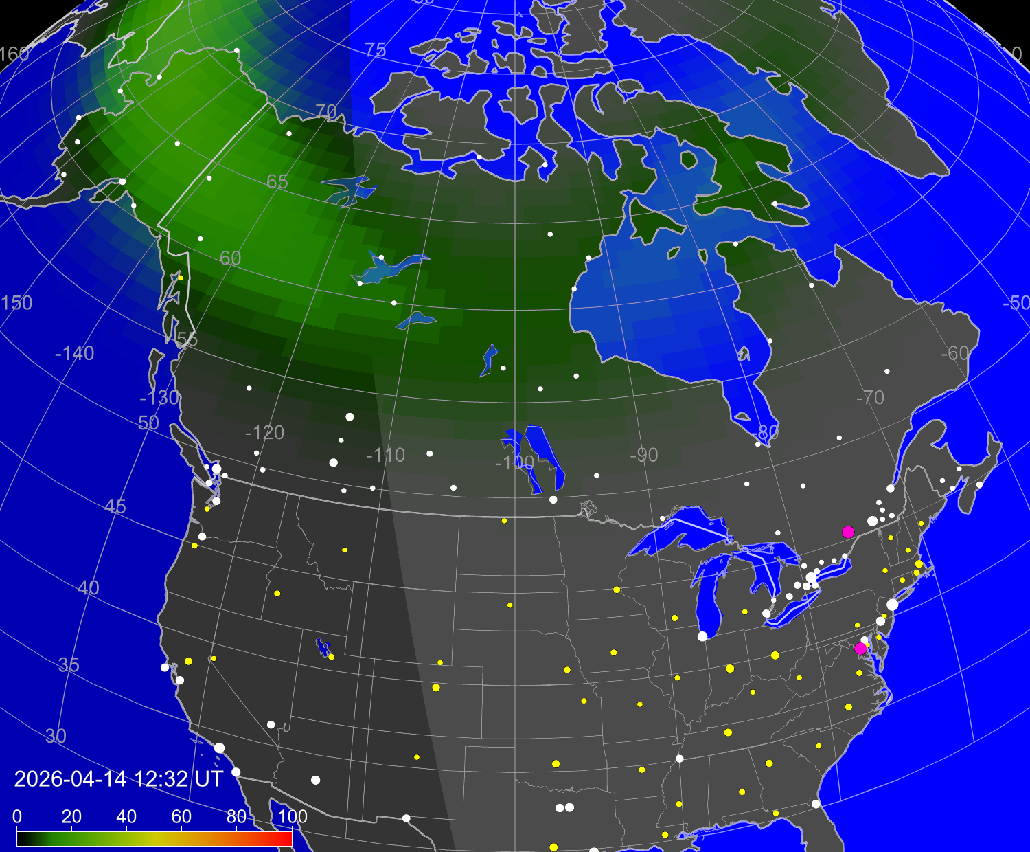 Probability of northern lights (auroras) in cities of United States