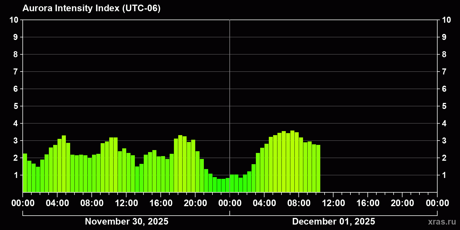 Auroral intensity index and the theoretically possible latitude of observations for nighttime in the Western Hemisphere as of 2025-12-01 08:20 (end of day) local time