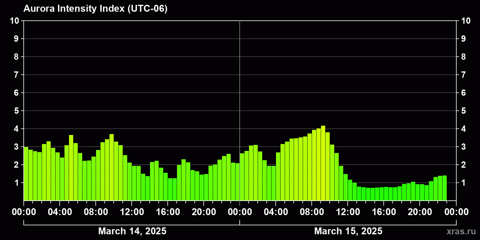 Changes in the auroral intensity index from 2025-03-14 to 2025-03-15 local time