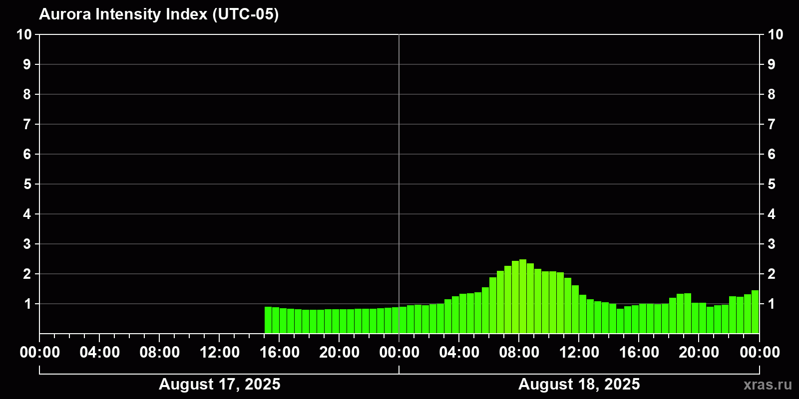 Changes in the auroral intensity index from 2025-08-17 to 2025-08-18 local time