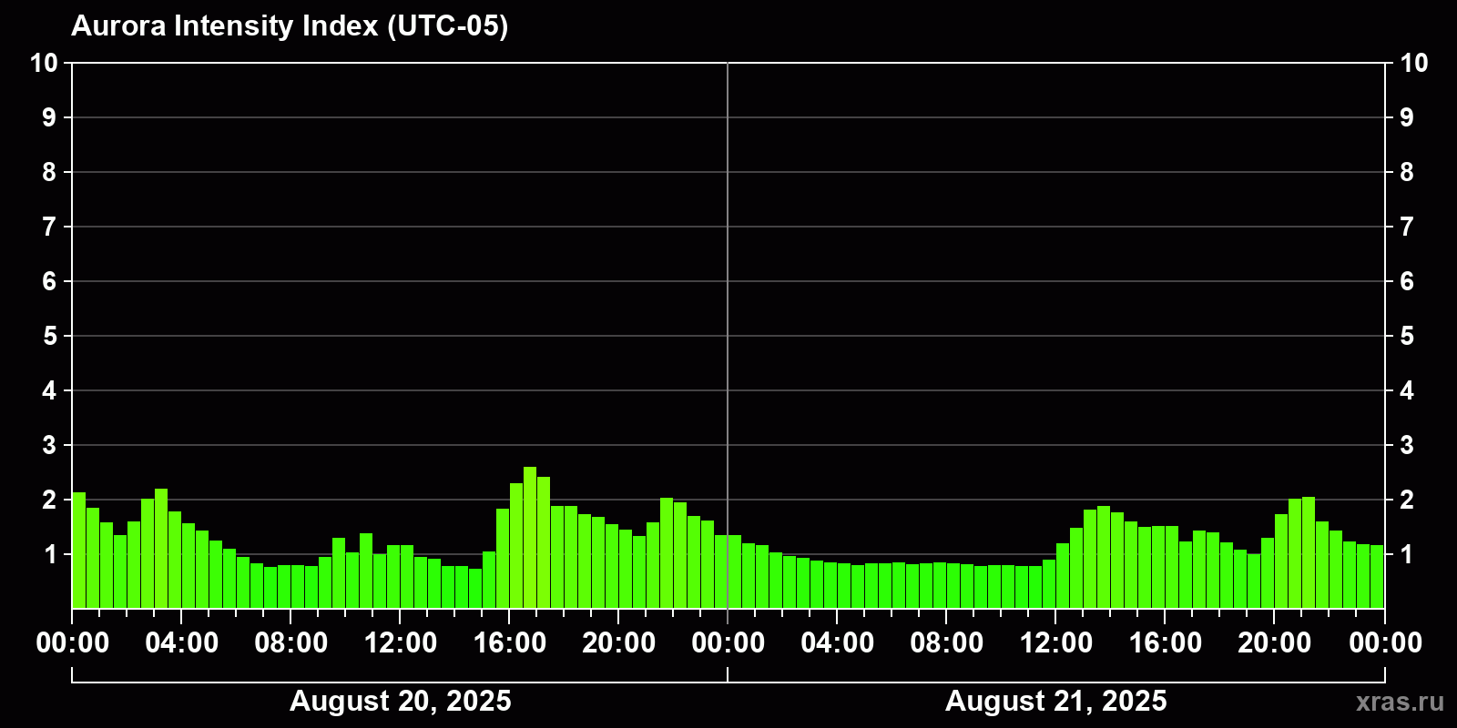 Auroral intensity index and the theoretically possible latitude of observations for nighttime in the Western Hemisphere as of 2025-08-21 23:59 (end of day) local time