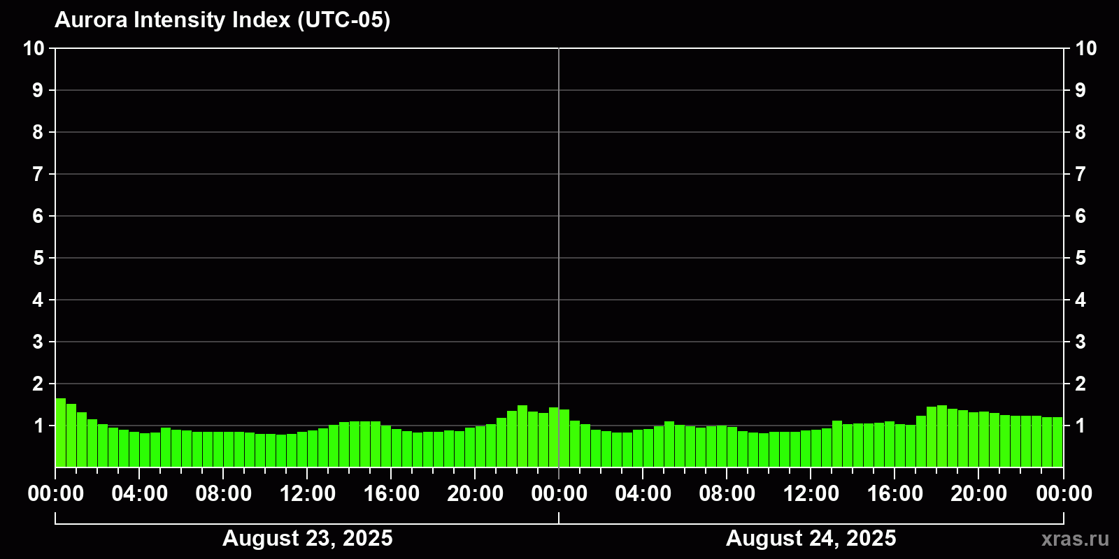 Auroral intensity index and the theoretically possible latitude of observations for nighttime in the Western Hemisphere as of 2025-08-24 23:52 (end of day) local time