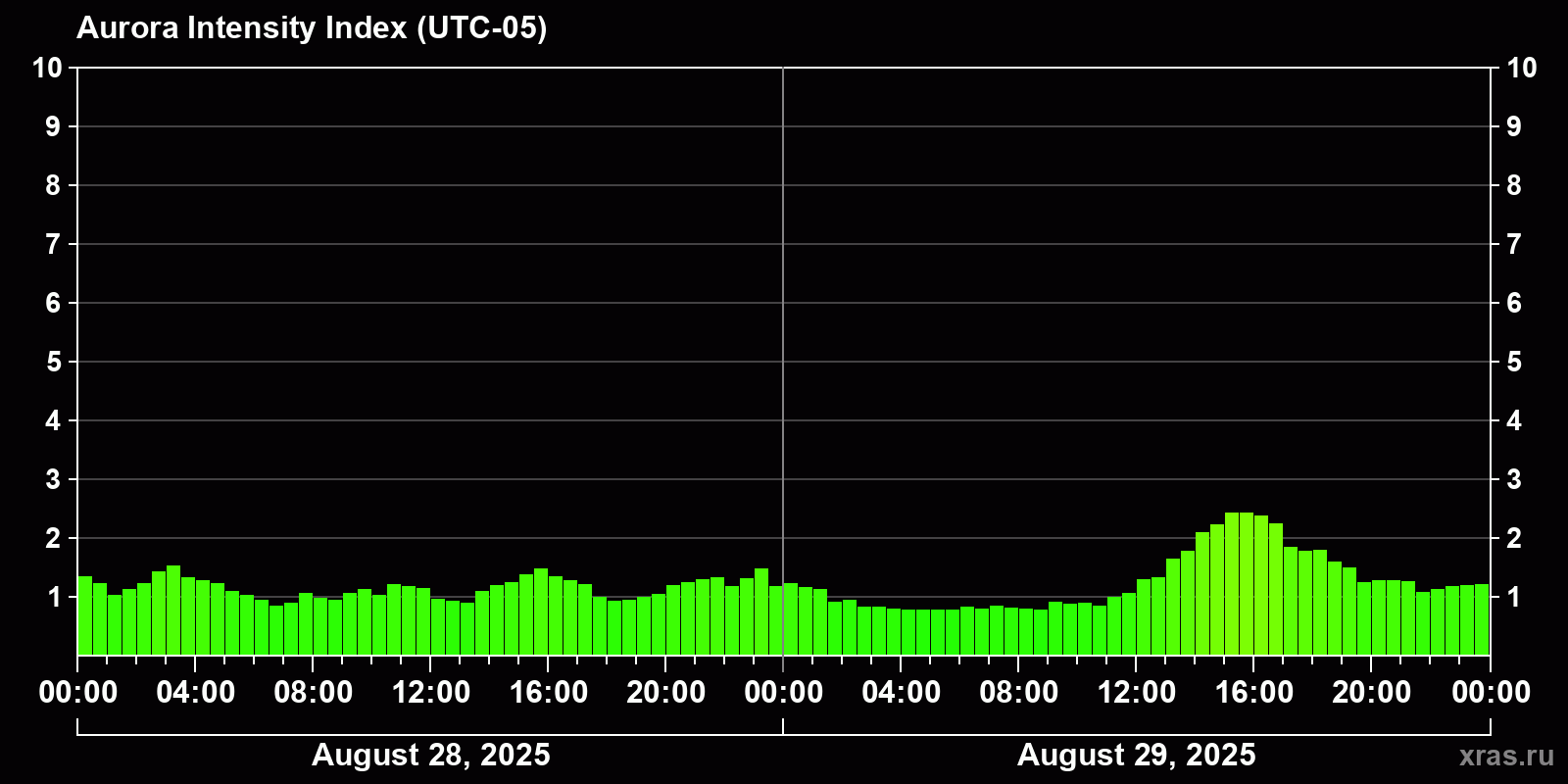 Auroral intensity index and the theoretically possible latitude of observations for nighttime in the Western Hemisphere as of 2025-08-29 23:55 (end of day) local time