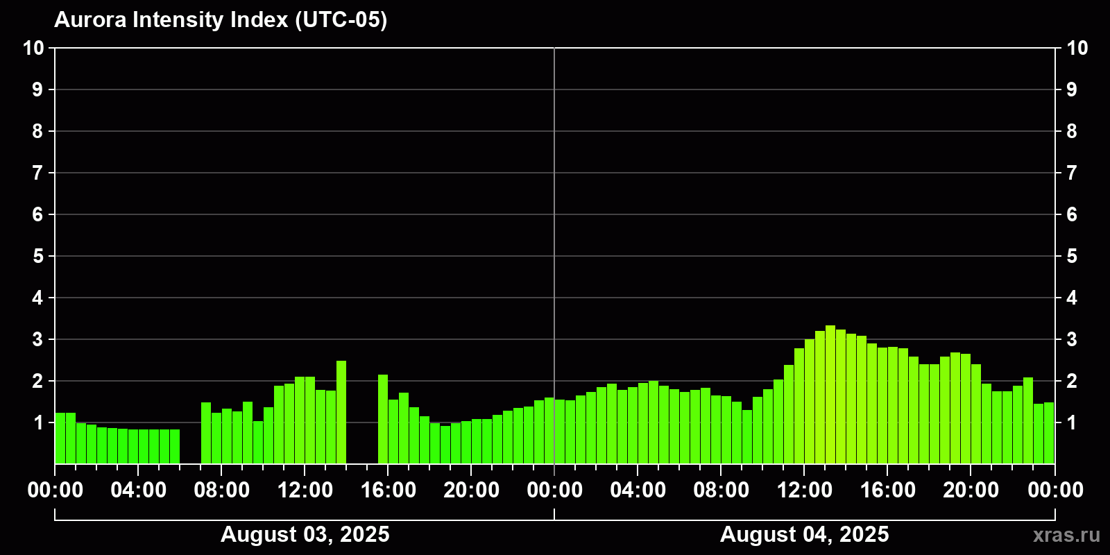 Changes in the auroral intensity index from 2025-08-03 to 2025-08-04 local time