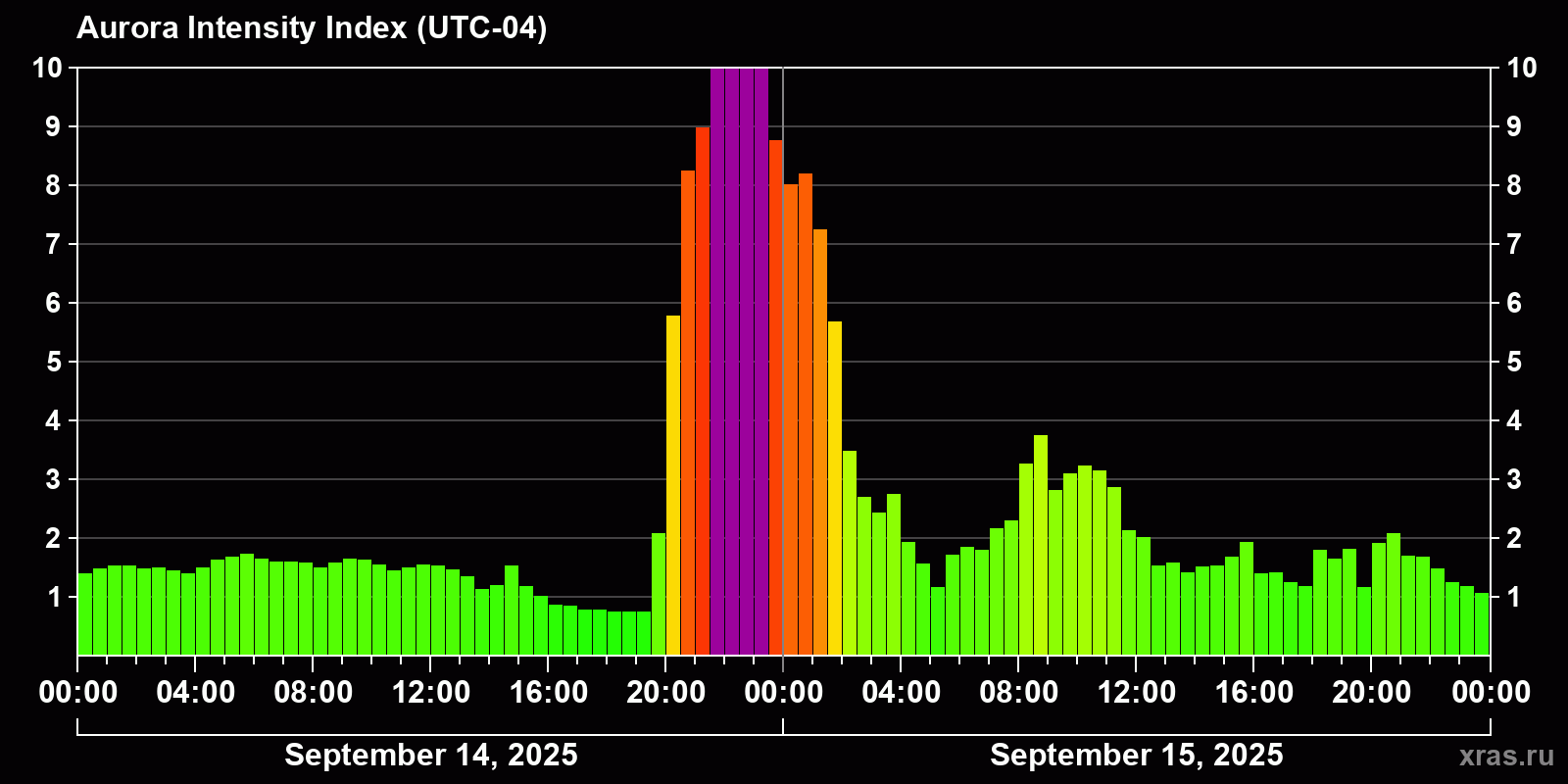 Changes in the auroral intensity index from 2025-09-14 to 2025-09-15 local time