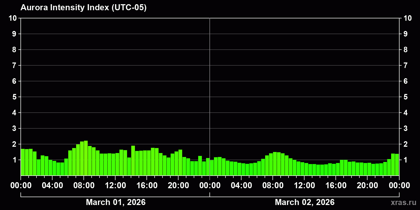 Changes in the auroral intensity index from 2026-03-01 to 2026-03-02 local time
