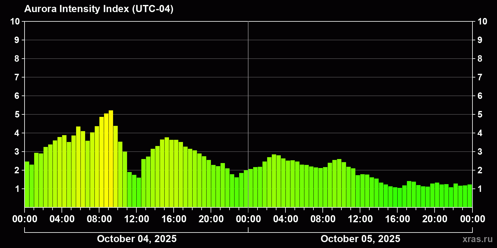 Changes in the auroral intensity index from 2025-10-04 to 2025-10-05 local time