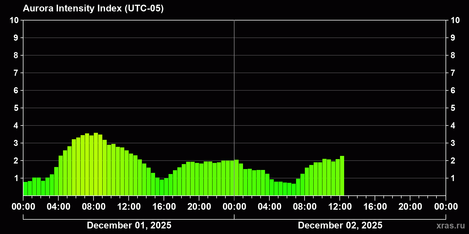 Изменения и часовой прогноз индекса интенсивности полярных сияний с 2025-11-30 по 2025-12-01