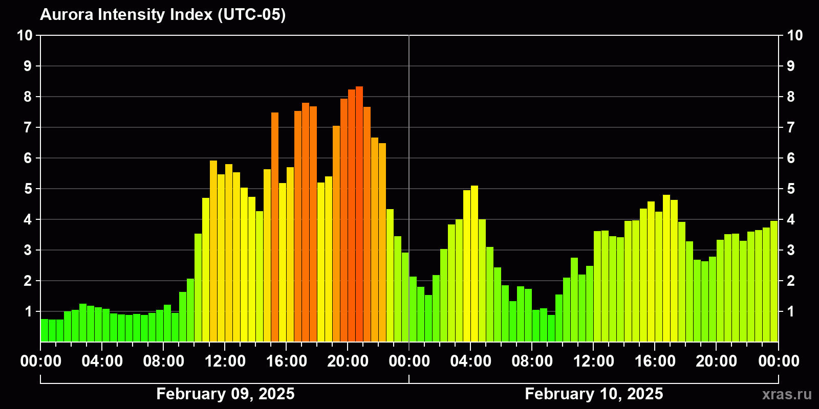 Changes in the auroral intensity index from 2025-02-09 to 2025-02-10 local time