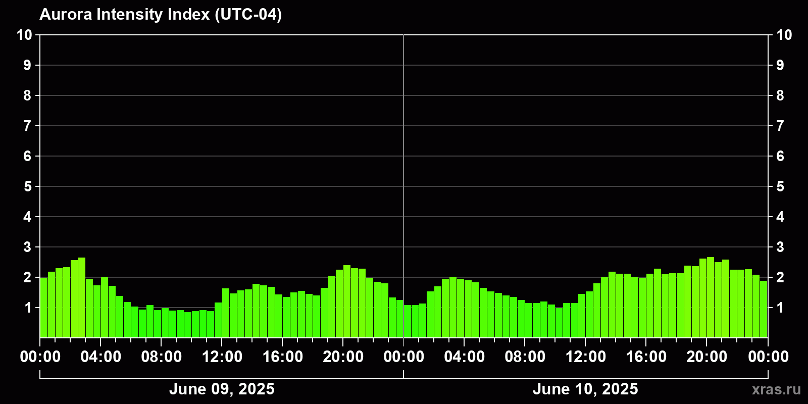 Auroral intensity index and the theoretically possible latitude of observations for nighttime in the Western Hemisphere as of 2025-06-10 23:46 (end of day) local time