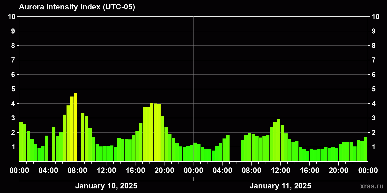 Changes in the auroral intensity index from 2025-01-10 to 2025-01-11 local time