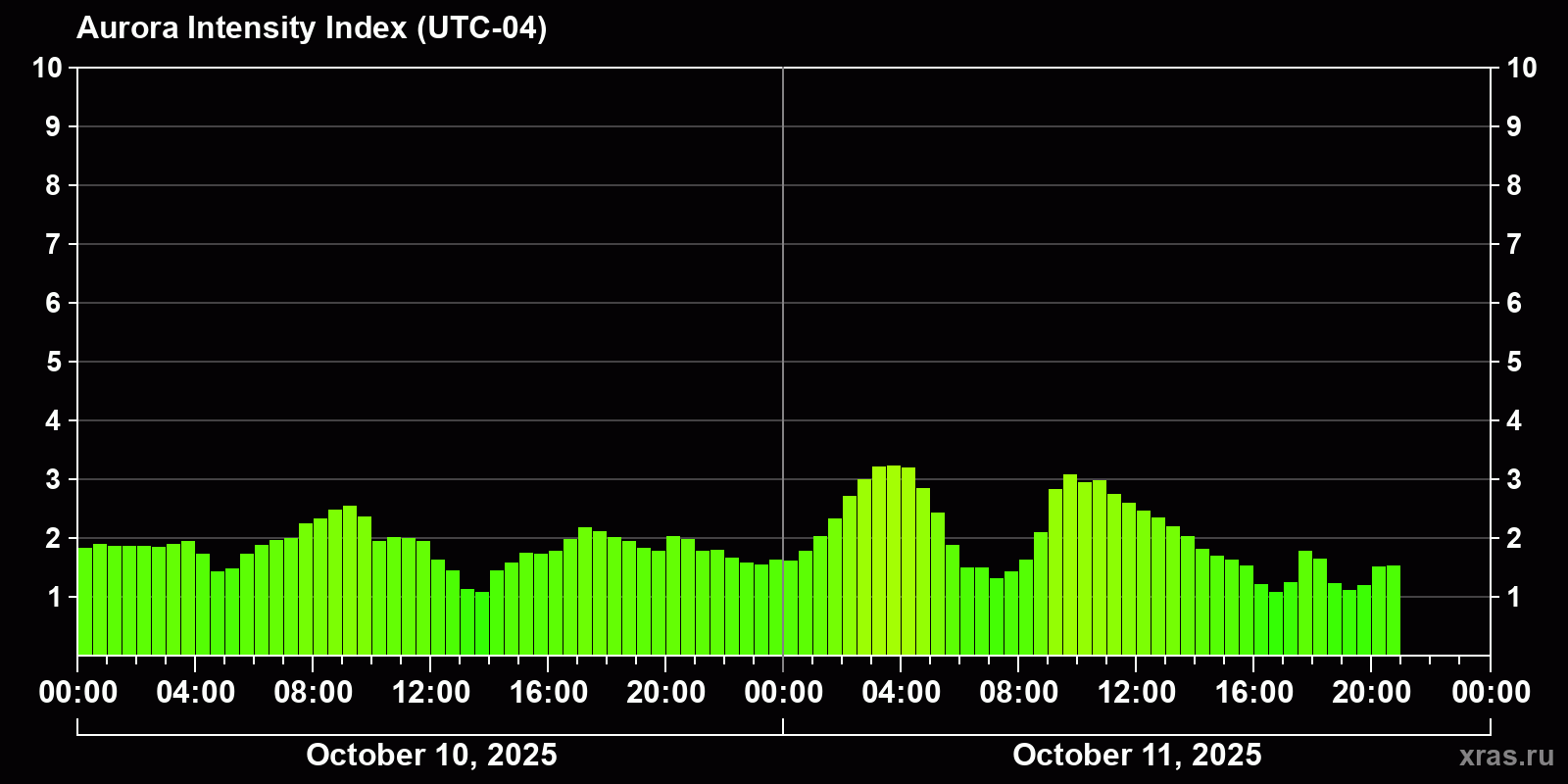 Auroral intensity index and the theoretically possible latitude of observations for nighttime in the Western Hemisphere as of 2025-10-11 18:37 (end of day) local time
