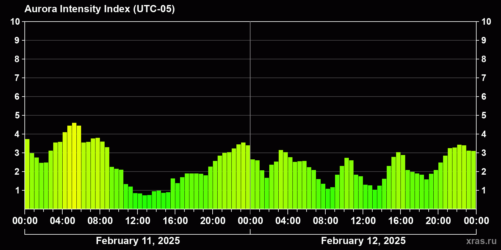 Auroral intensity index and the theoretically possible latitude of observations for nighttime in the Western Hemisphere as of 2025-02-12 23:48 (end of day) local time