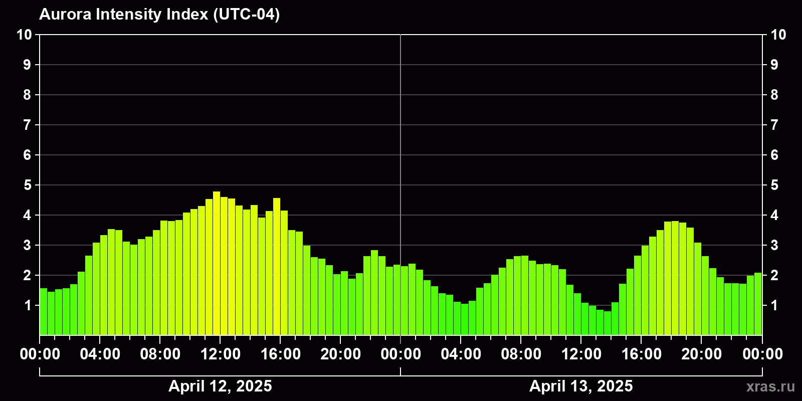 Auroral intensity index and the theoretically possible latitude of observations for nighttime in the Western Hemisphere as of 2025-04-13 23:46 (end of day) local time