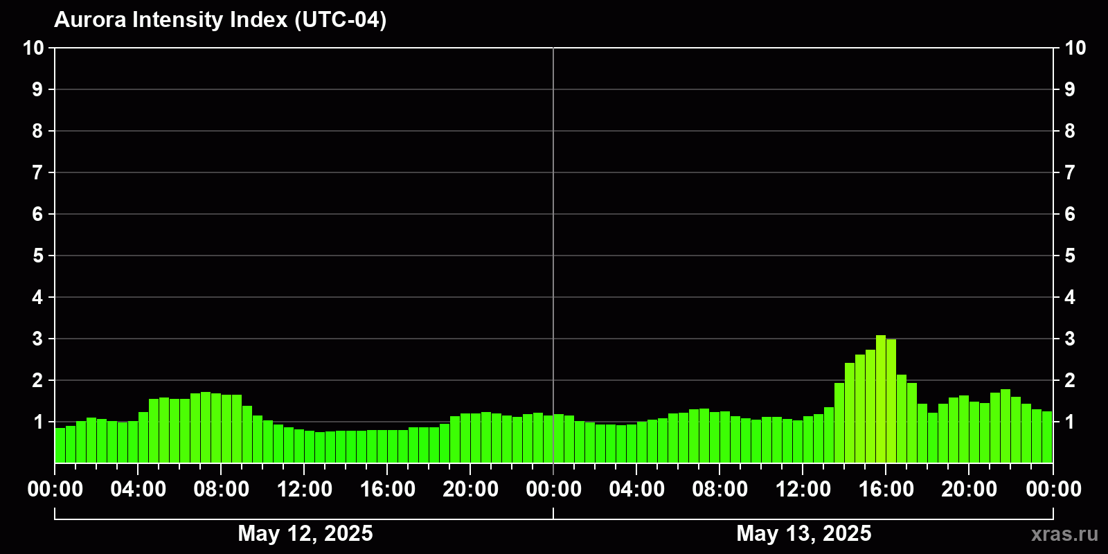 Auroral intensity index and the theoretically possible latitude of observations for nighttime in the Western Hemisphere as of 2025-05-13 23:59 (end of day) local time