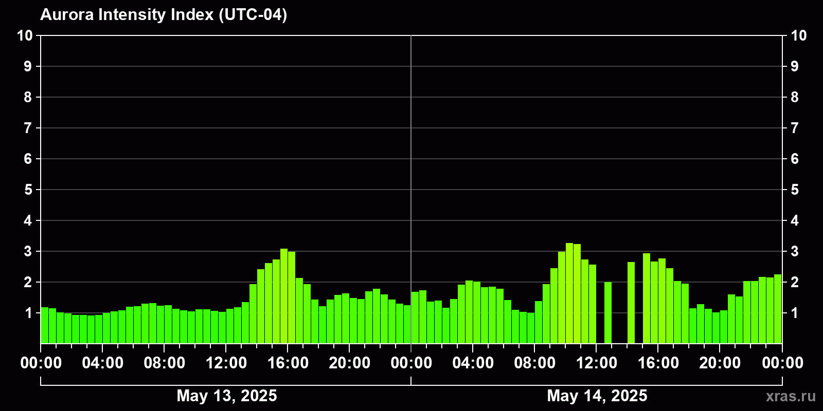 Changes in the auroral intensity index from 2025-05-13 to 2025-05-14 local time