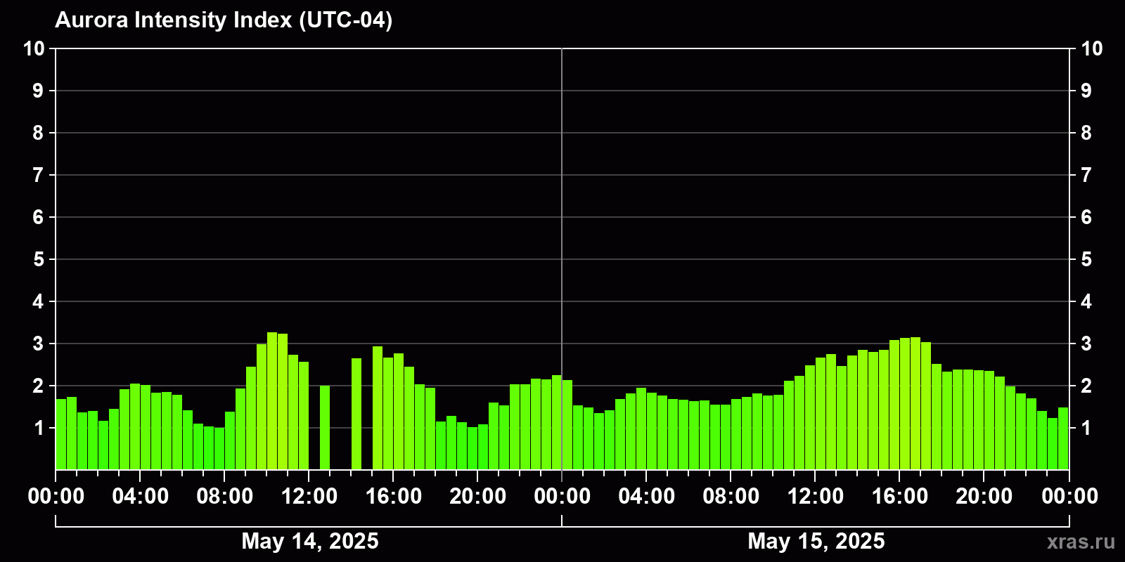 Auroral intensity index and the theoretically possible latitude of observations for nighttime in the Western Hemisphere as of 2025-05-15 23:54 (end of day) local time