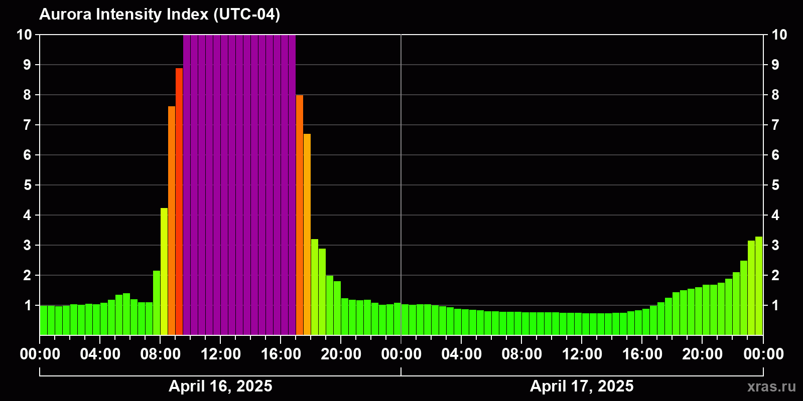 Changes in the auroral intensity index from 2025-04-16 to 2025-04-17 local time