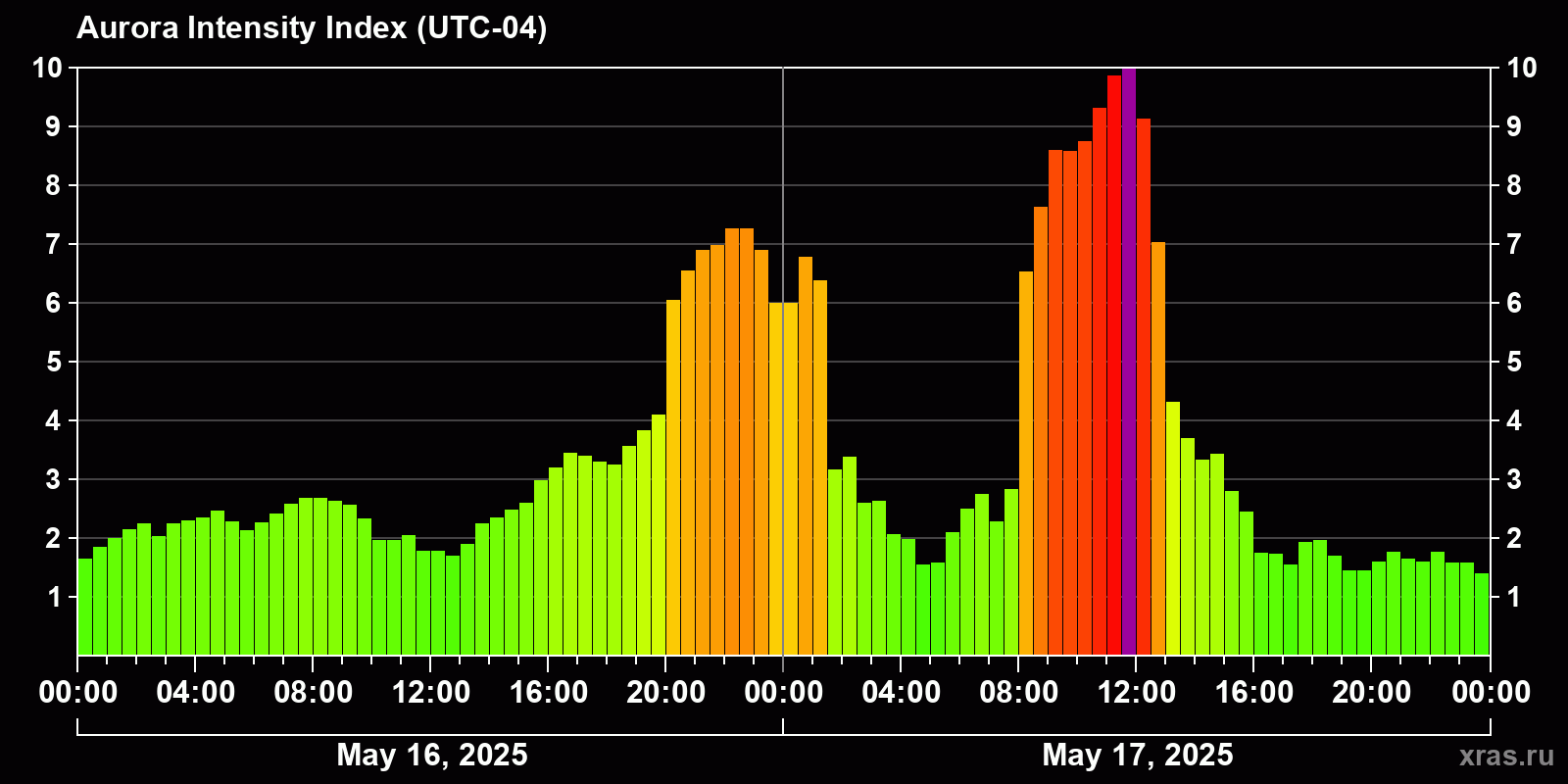 Changes in the auroral intensity index from 2025-05-16 to 2025-05-17 local time