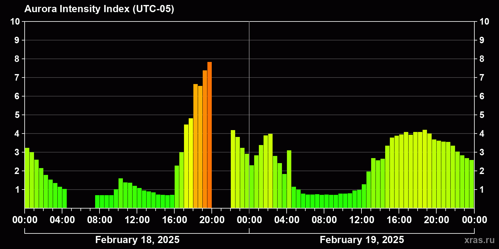Auroral intensity index and the theoretically possible latitude of observations for nighttime in the Western Hemisphere as of 2025-02-19 23:47 (end of day) local time