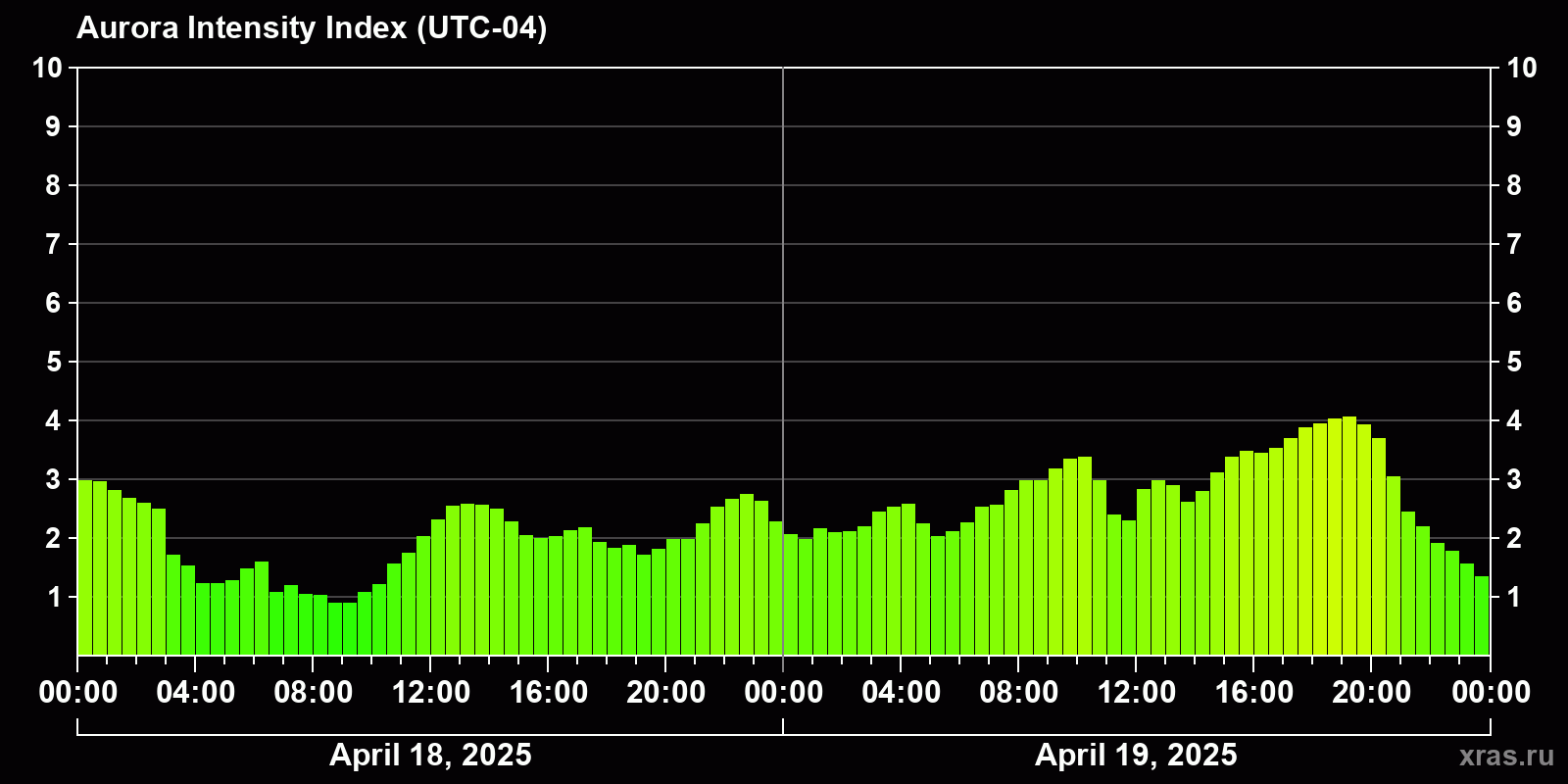 Auroral intensity index and the theoretically possible latitude of observations for nighttime in the Western Hemisphere as of 2025-04-19 23:54 (end of day) local time