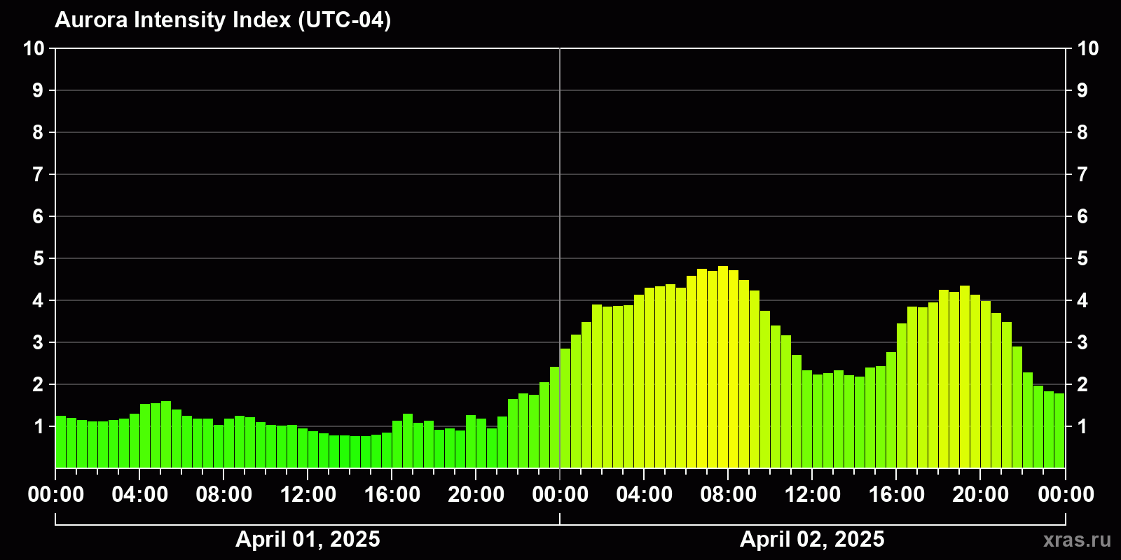 Auroral intensity index and the theoretically possible latitude of observations for nighttime in the Western Hemisphere as of 2025-04-02 23:50 (end of day) local time