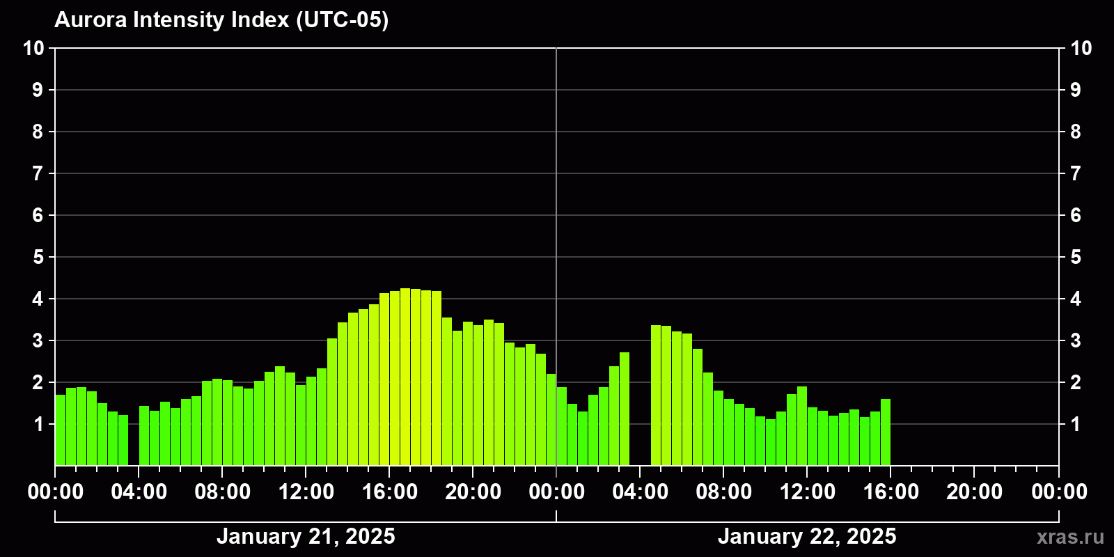 Auroral intensity index and the theoretically possible latitude of observations for nighttime in the Western Hemisphere as of 2025-01-22 15:44 (end of day) local time