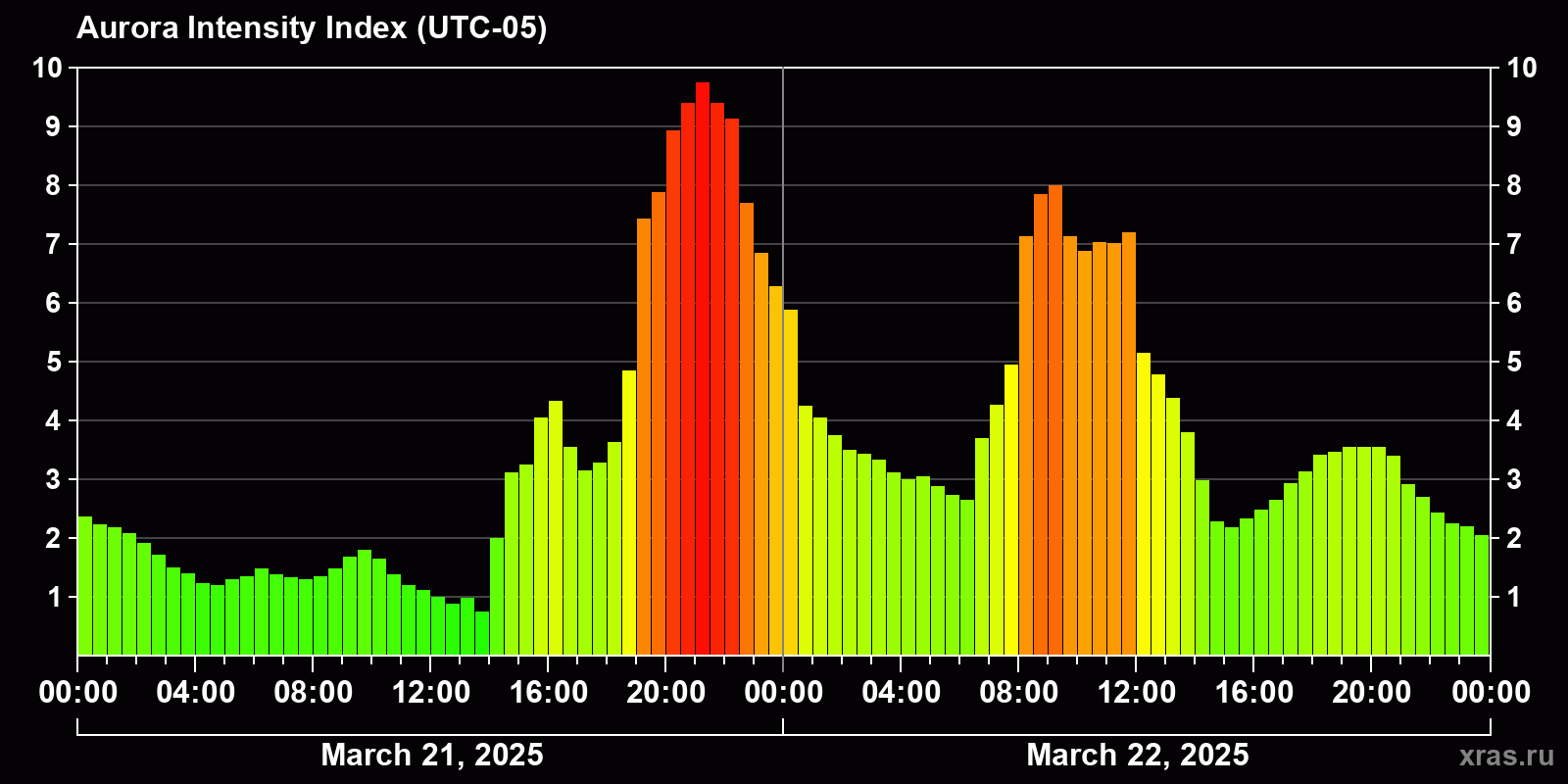 Changes in the auroral intensity index from 2025-03-21 to 2025-03-22 local time