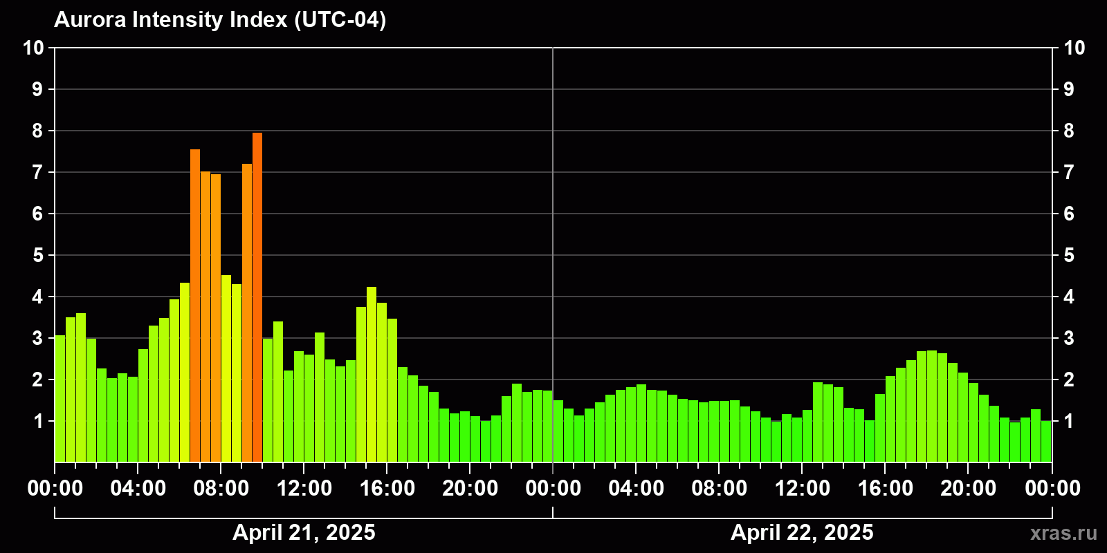 Changes in the auroral intensity index from 2025-04-21 to 2025-04-22 local time