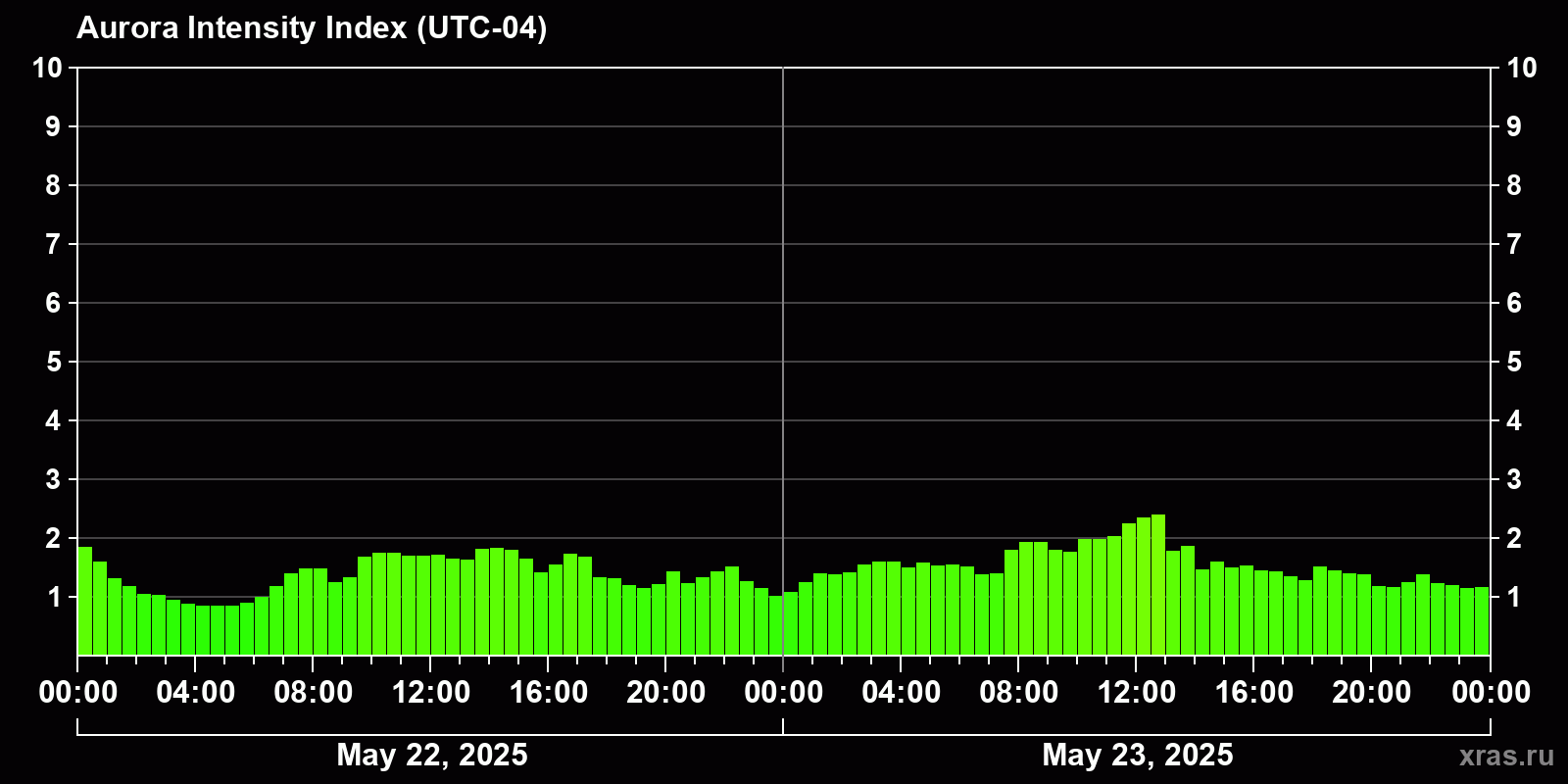 Auroral intensity index and the theoretically possible latitude of observations for nighttime in the Western Hemisphere as of 2025-05-23 23:48 (end of day) local time