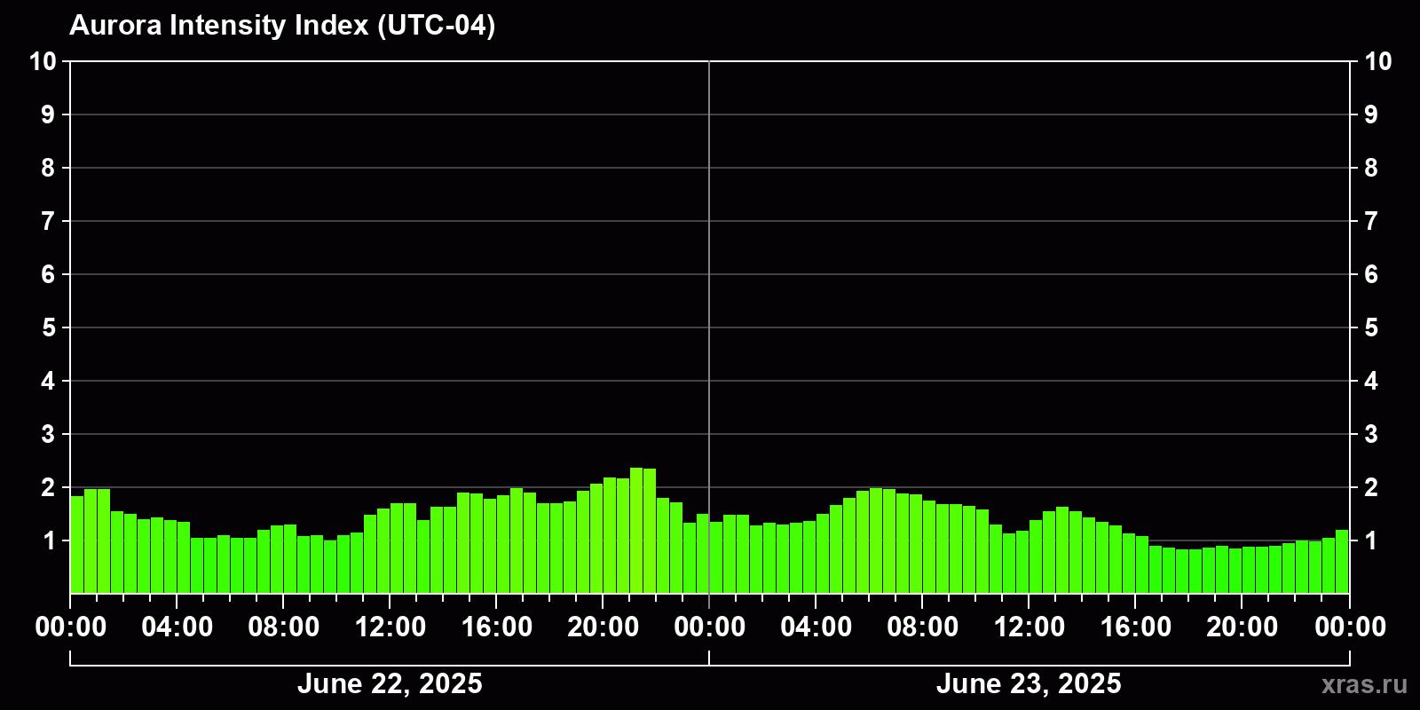 Auroral intensity index and the theoretically possible latitude of observations for nighttime in the Western Hemisphere as of 2025-06-23 23:59 (end of day) local time