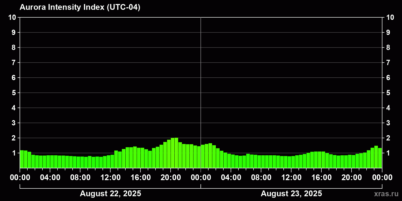 Auroral intensity index and the theoretically possible latitude of observations for nighttime in the Western Hemisphere as of 2025-08-23 23:56 (end of day) local time
