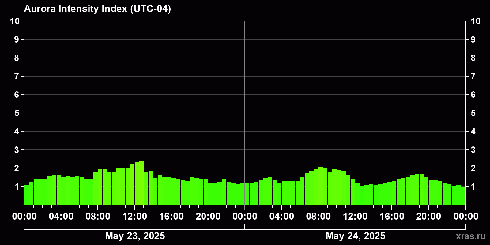Changes in the auroral intensity index from 2025-05-23 to 2025-05-24 local time